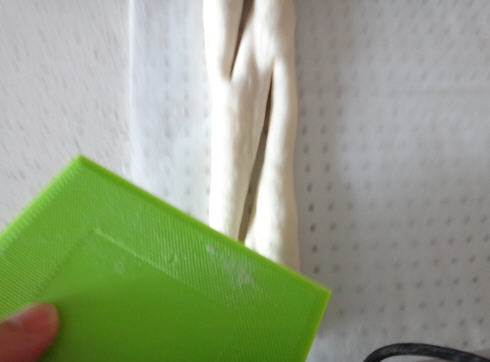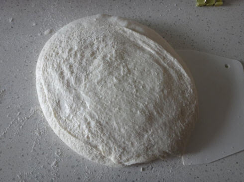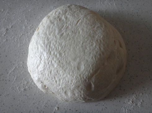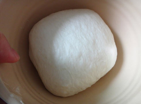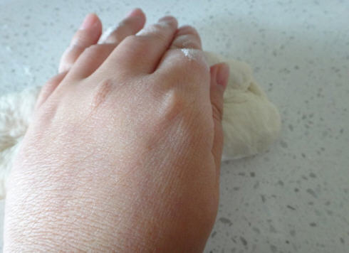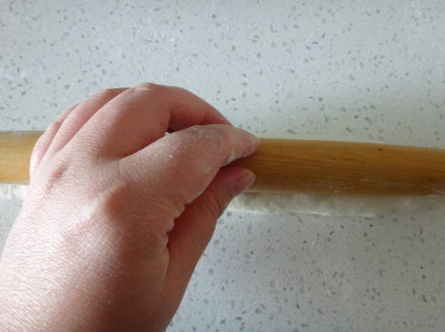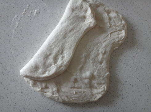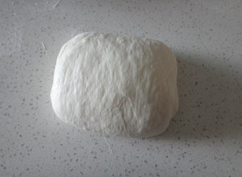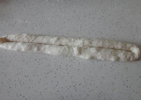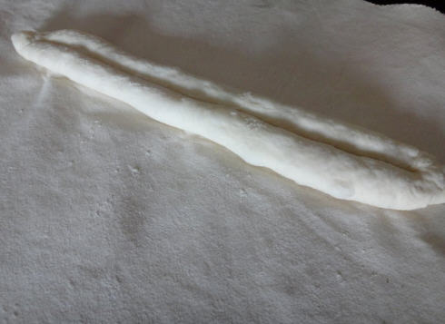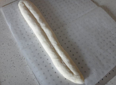 5、用拱形掌轻拍面团排气,按橄榄形面团的整形方法,搓成棍子形状