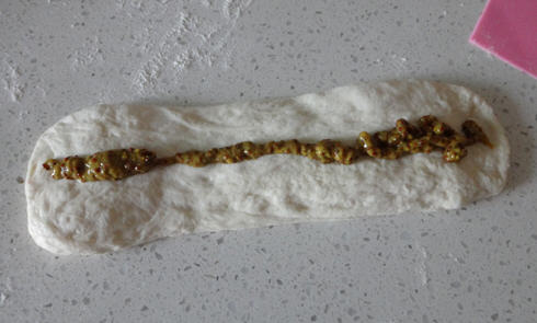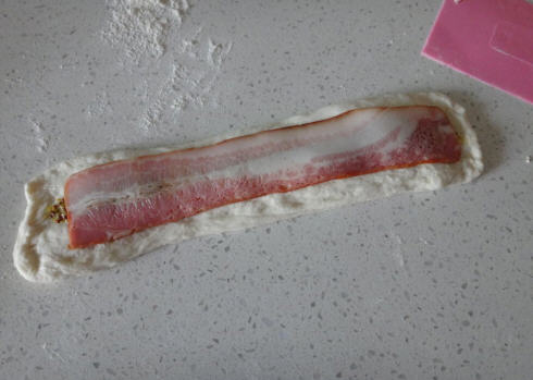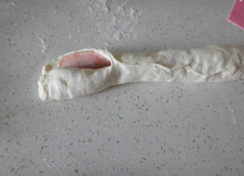 7、整形方法二:拍扁撑长面团,中间挤黄芥末酱,放上一片培根,卷起收口,搓长,放入发酵布进行二发,完成后中线一字割包,备烤。