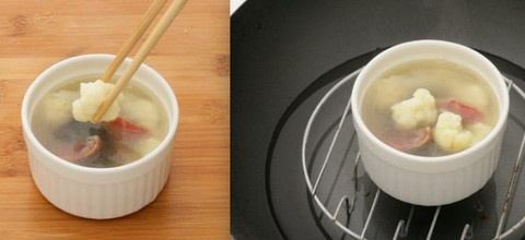 如果你不喜欢吃菜花,怎么做都不会好吃,充其量算是能吃下。喜欢菜花的话,这样做不是最佳烹饪,不过胜在简单、少油脂,炖一小盅,是连汤都有了。所以喜欢吃的朋友可以在家试做一下这道香肠木耳菜花盅。