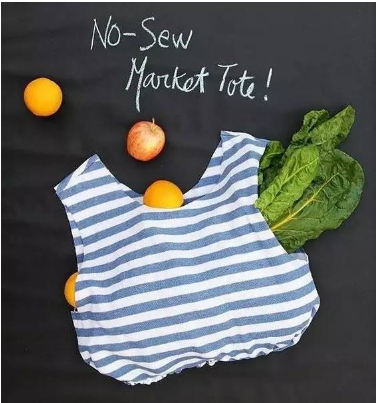 将T恤底部缝合,拎着左右肩膀部分就成一个包包了,出门买菜环保轻便,在家收纳置物整洁健康。