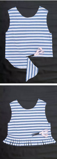 先把领口剪至腰身大小,然后把袖子往前系一个美美的蝴蝶结,旧T恤就变成一件时尚的半身裙。