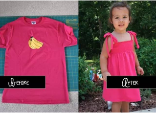 自己穿过的T恤,剪掉领口和袖口,在T恤上部一圈缝上褶皱,用剪下来的布料做成肩带,就可以变成宝贝的小裙子。