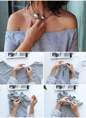 将领口剪得更大,在剪开处缝上皮筋,一件今夏最流行的露肩装绝对抢眼。