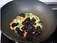 把山药去皮切菱形块儿,黄瓜和胡萝卜切块儿,木耳洗干净。