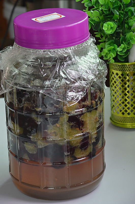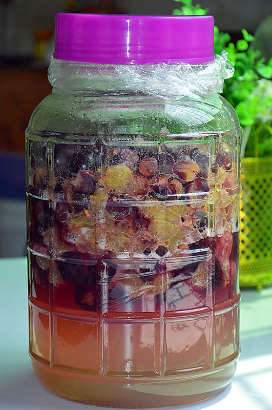 发酵两天后的样子,记得在发酵高峰期,用筷子把上面的葡萄往下压,使葡萄更好的与汁溶合,可以增加葡萄的颜色的哦