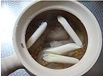 砂锅内放猪蹄、黄豆、葱断儿、姜片,一次性加入足量的水。