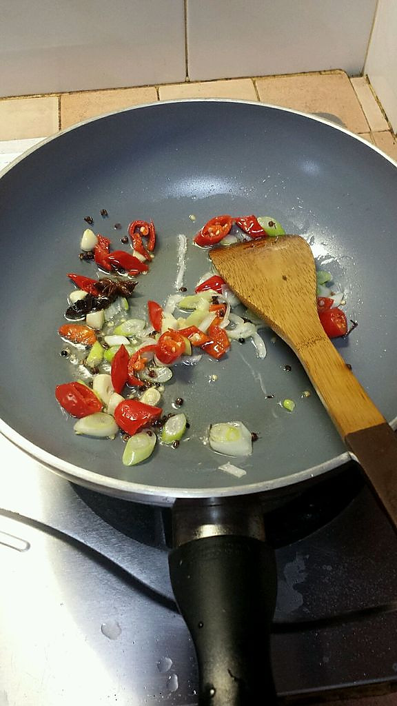 锅中倒油,加入葱花,辣椒,蒜片,八角,花椒爆香。