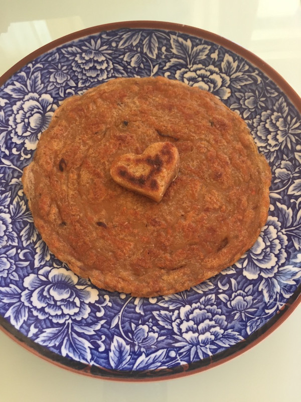 锅内用刷子涂抹一层油,然后用勺挖搅好的蔬菜面糊,摊成自己喜欢的形状
