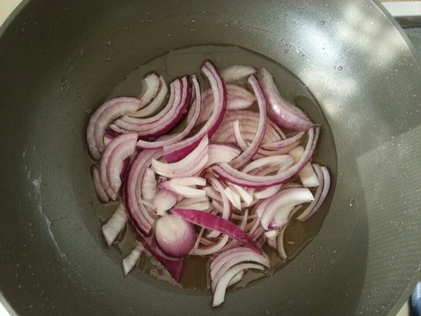 100克猪油放到锅里,加入半个切丝的洋葱头。熬猪油的做法在上一个菜谱里有详细的说明。