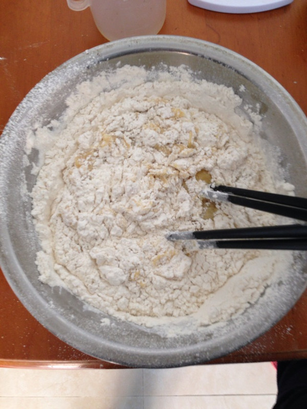 努力搅拌均匀,可以看到如果那个打蛋器能捞到大块头香蕉就要用调羹什么的压碎啦,木有办法我实在是不忍揉捏太多导致这种结果,所以你们之前要揉捏充分啊!