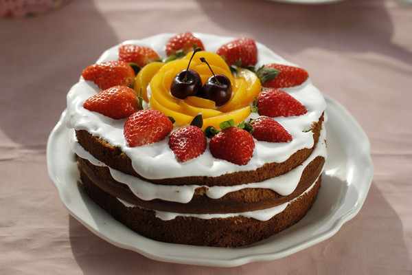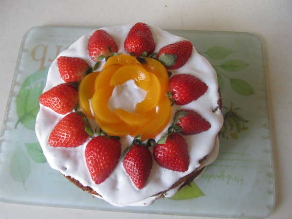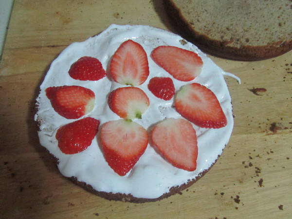 .将蛋糕片上涂抹一层奶油, 放上草莓片;再同样操作一次;