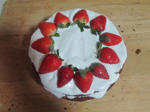 再上面一层涂抹奶油后将草莓沿着边缘放上一圈;