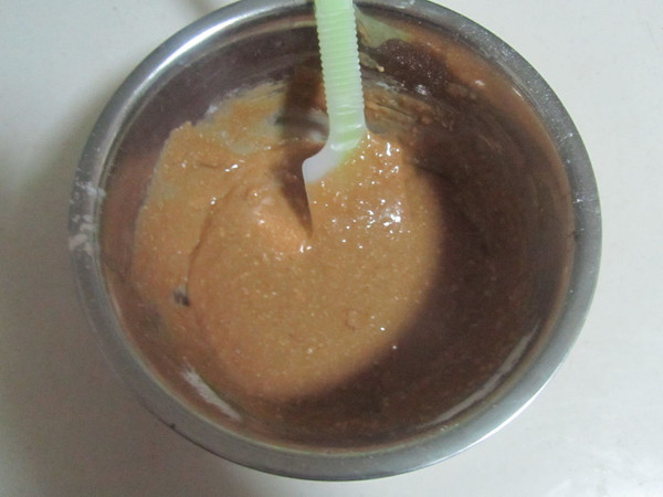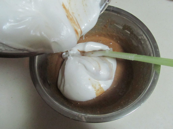 将搅拌好的液体再倒入剩余的三分之二打发的蛋清中,将它们搅拌均匀;