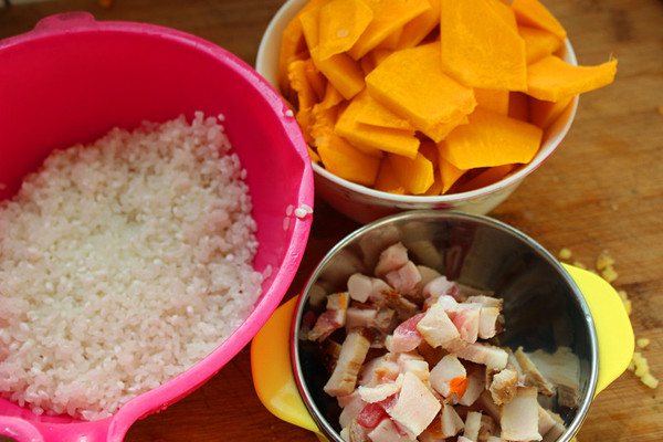 南瓜选那种圆圆的小金瓜比较好吃。去皮切片,五花肉切丁,米洗净。