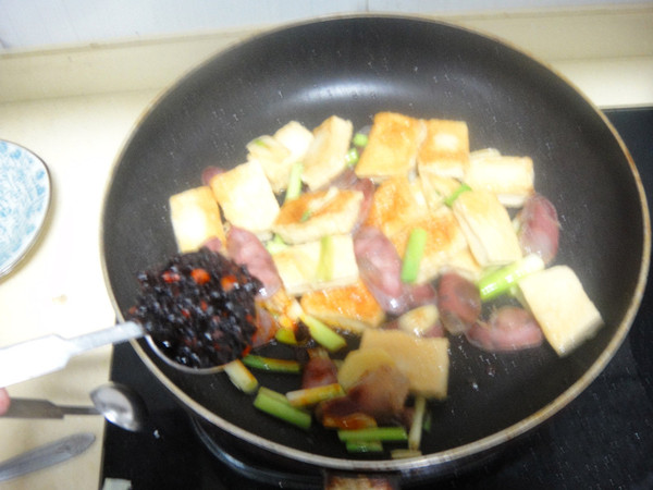 煎好的豆腐回锅加入一勺豆豉辣椒酱和10生抽毫升后煸炒均匀
