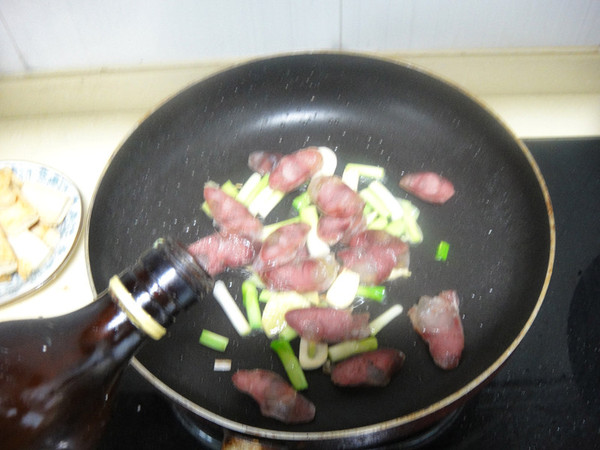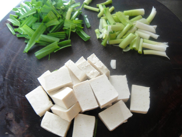 把千页豆腐切片,青蒜洗净后把梗和叶分开切段