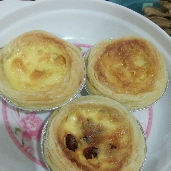 然后倒进蛋挞皮八分满,我放了蔓越莓干,你们也可以放芒果呀和其他水果