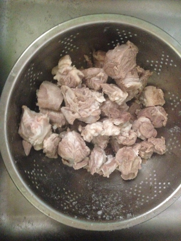 将羊肉洗净,锅内烧水下羊肉,水开后焯5分钟,然后倒入凉水里将浮沫洗净。