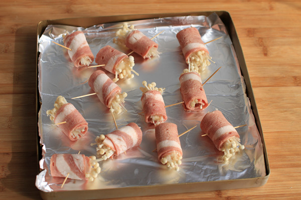 烤盘垫上锡纸(虽然是不沾烤盘,但是铺了就不用洗擦擦了,懒人嘛),培根卷用牙签定型,放在烤盘中。 如果没有烤箱用平底锅煎也一样。