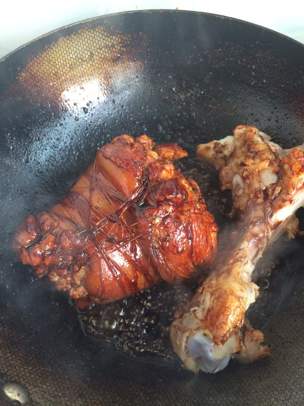 给肘子上色,(有点溅油,关小火)加老抽小火炒一会儿,色匀后,顺便放上大骨头