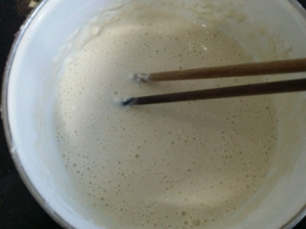 将面粉糊倒入鸡蛋牛奶液中,拌匀