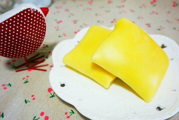 舀一勺面糊放入不粘锅,晃动不粘锅使面糊成薄饼状,小火,不用翻面,糊凝固后出锅