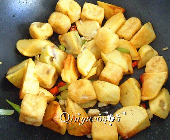 放炸过的土豆和豆腐。稍炒。