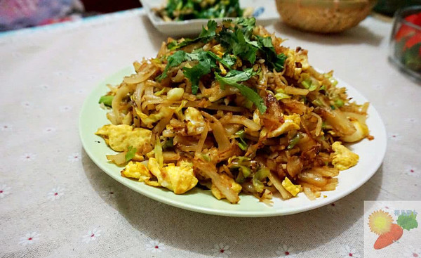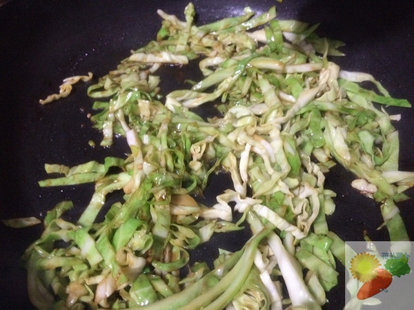 重新做过,少许色拉油,爆香姜末后,放入卷心菜丝翻炒,加入适量生抽和盐。翻炒1分钟倒入饼丝,继续翻炒。