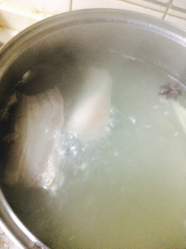 五花肉凉水下锅,撇去浮沫,水开后下入姜和八角,倒一勺料酒,水沸腾后转小火熬制肉汤,半小时后关火,捞出肉块切薄片,肉汤留用。