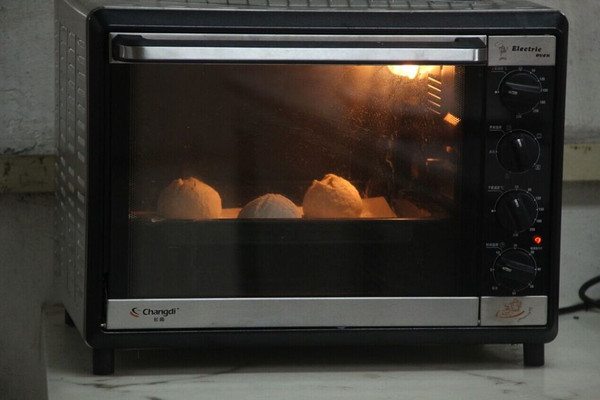 发酵好后,放入烤箱烘烤(倒数第二层,如图所示),上火200度,下火180度,烤40分钟即可