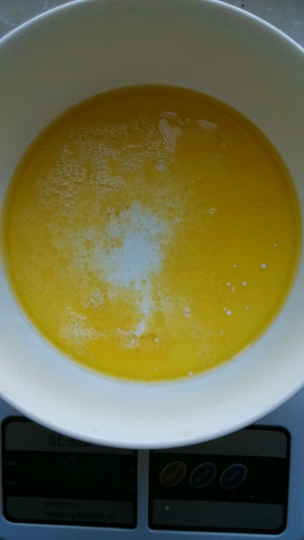 将白砂糖、纯牛奶、炼乳放入已经融化好的黄油中,搅拌均匀。