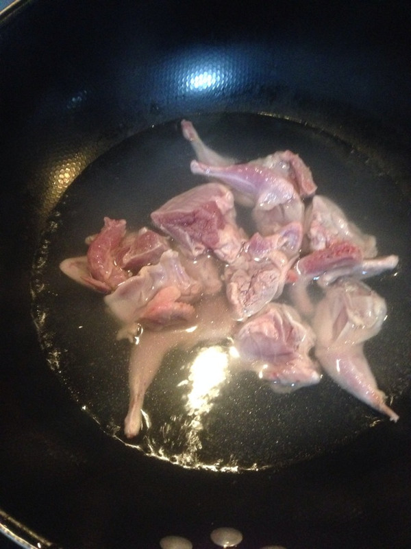 把用料放入油锅炸一下,出香味后放入鹌鹑肉。进行翻炒,开中小火