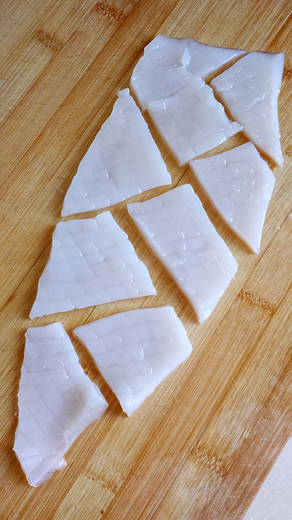 很肥的大鱿鱼阿,用剪刀从中间剪开,去掉内脏,眼睛牙啥啥的