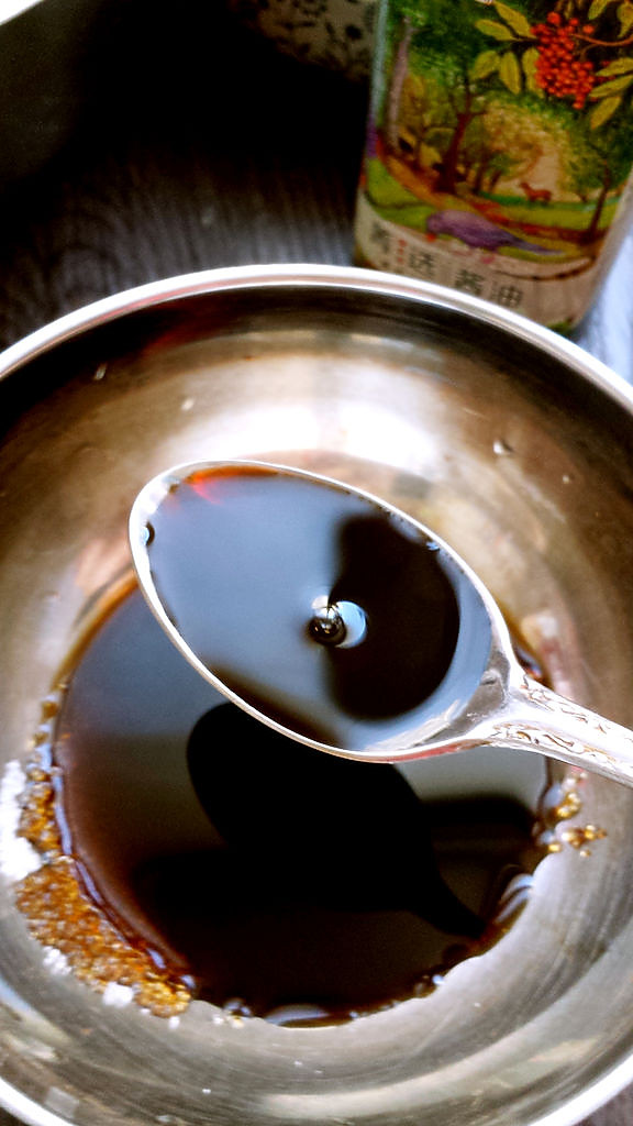调宫保汁,菁选酱油一勺,老抽半勺,陈醋两勺,糖两勺