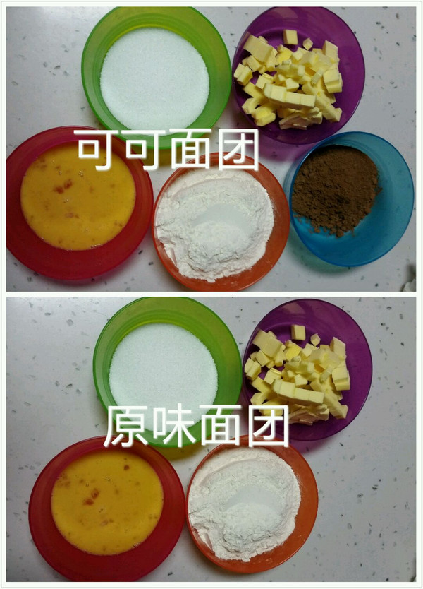 重复以上步骤制作可可面团,可可粉要和低粉混合过筛。冷藏30分钟