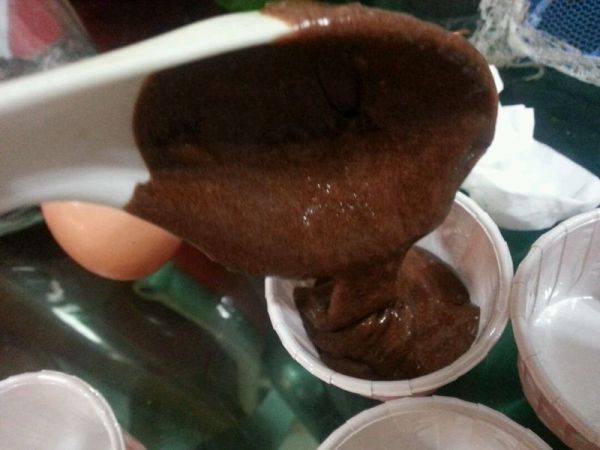 由于搅拌后的面糊比较稠厚,借助汤勺刮刀将面糊装入机制杯中