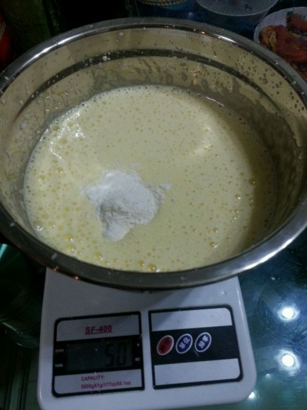 5个鸡蛋敲入打蛋盆,加入100g糖粉,打蛋器高速打发至颜色变成淡黄色体积蓬松质地稠厚发泡