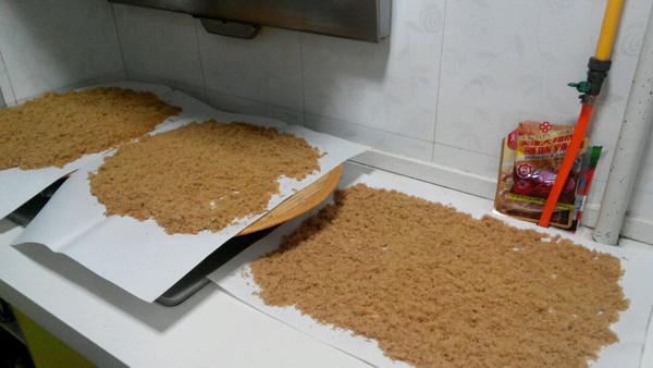 打好的肉松,放在帘子上,铺上干净的纸(铺层纸还方便收),摊开,晾凉。