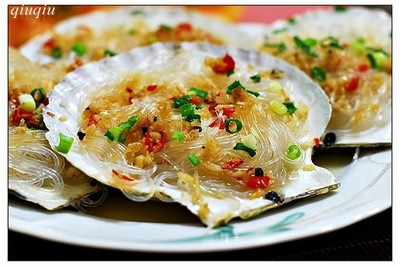 好,现在开始摆啦哈~~~ 我的顺序是:贝壳、粉丝、贝肉、芙蓉汁、红辣椒; 水烧开,放扇贝开始蒸~8-10分钟拿出来~~~ 锅中烧油~~~油热后,挨个浇在扇贝上~~~然后就可以放香菜啊~~葱啥的啦~~~