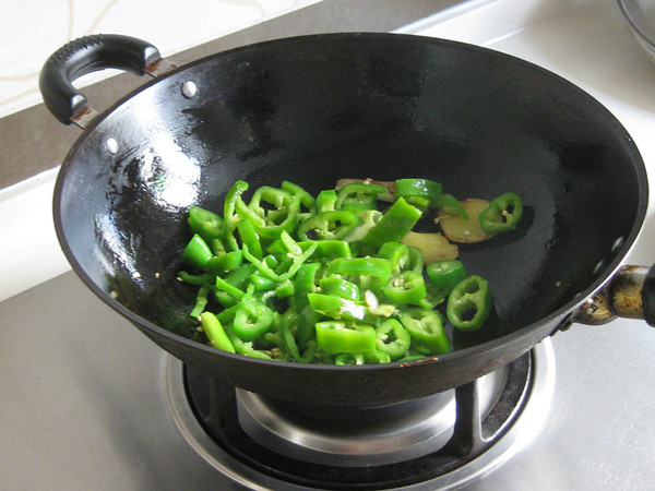 待葱姜出香味时,放入尖椒;