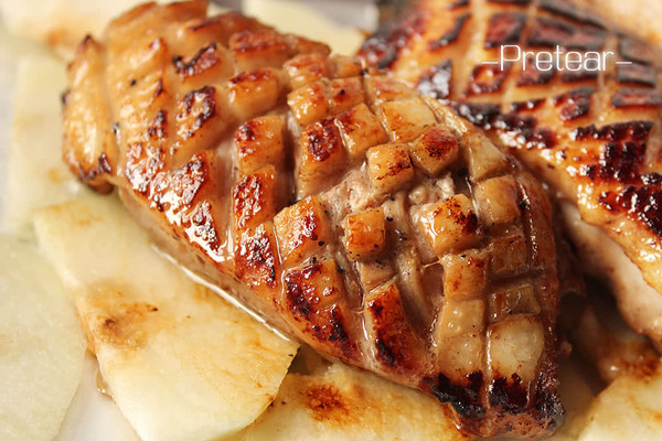 烤箱预热170°,烤盘里铺上锡纸,上面先码好梨子片然后把煎好的鸭胸放上去烤个6~10分钟。