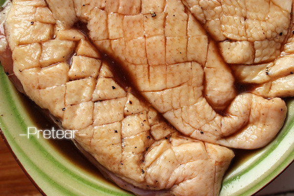 在鸭胸肉的皮上切十字花刀,只切到皮下就可以了,为了煎制的时候可以更好的把鸭皮上的油脂煎出来。