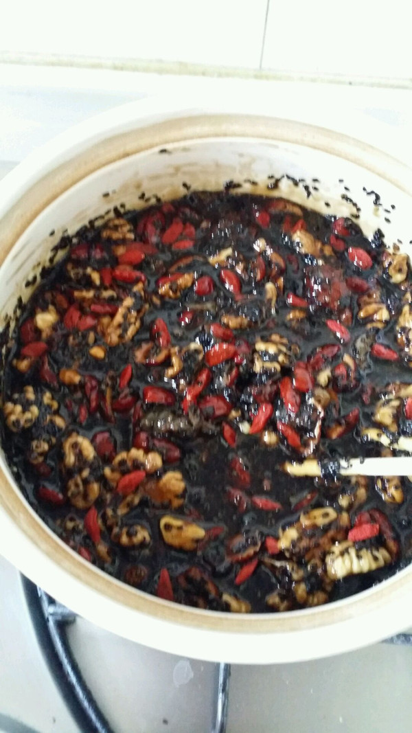 放入核桃,黑芝麻,我把它倒入砂锅熬,一般熬中药都是放砂锅熬