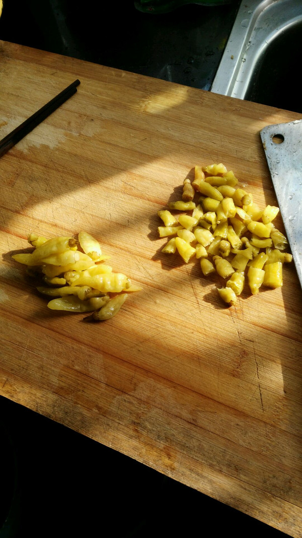 喜欢吃辣的亲们可以把泡椒切段,但是不要切太碎,会影响美观度。