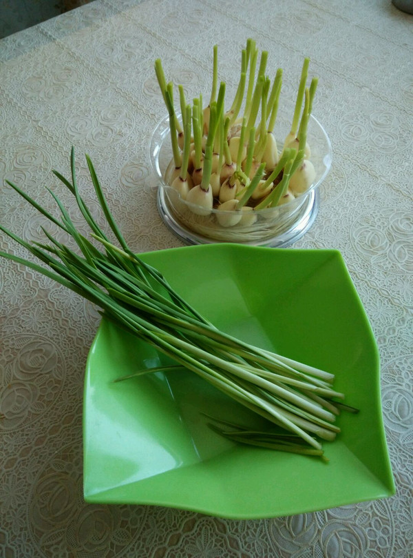 蒜头去皮竖着排好,倒入漫过蒜的3分之一水,4天后蒜苗就长成了。可以吃了纯绿色