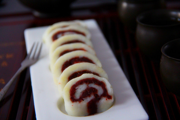 揭掉豆沙馅上面的保鲜袋,从一侧开始卷起山药卷,卷的时候双手扯着山药泥下面保鲜袋的两侧,用其余三根手指和拇指跟儿处配合向上卷,卷的同时扯掉保鲜袋。