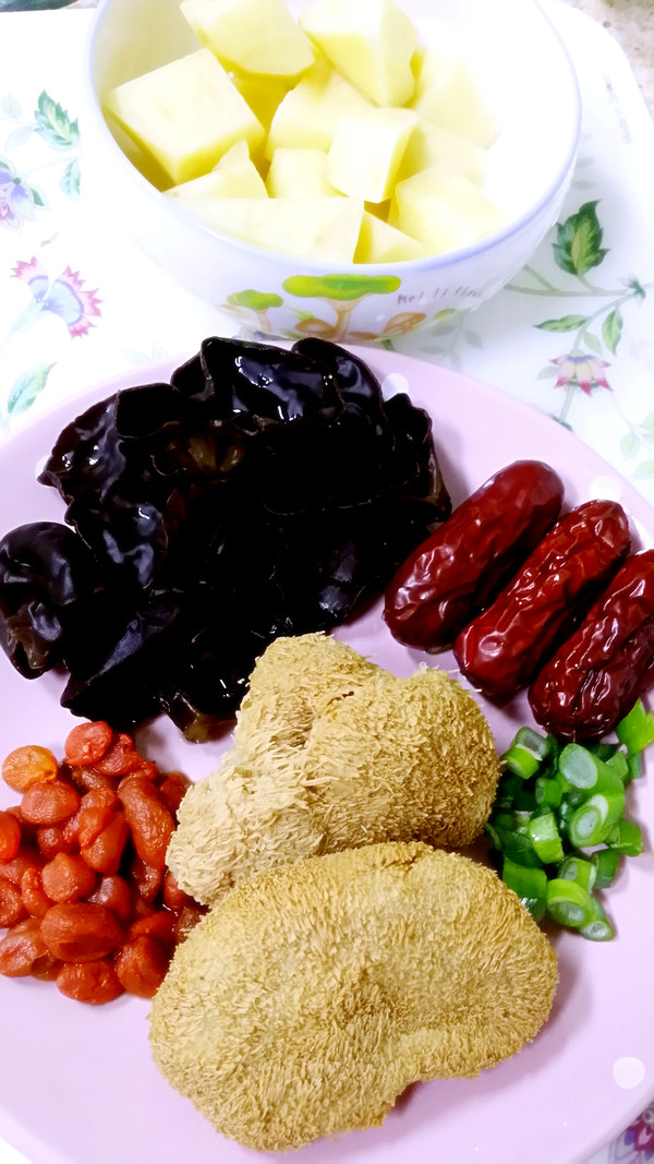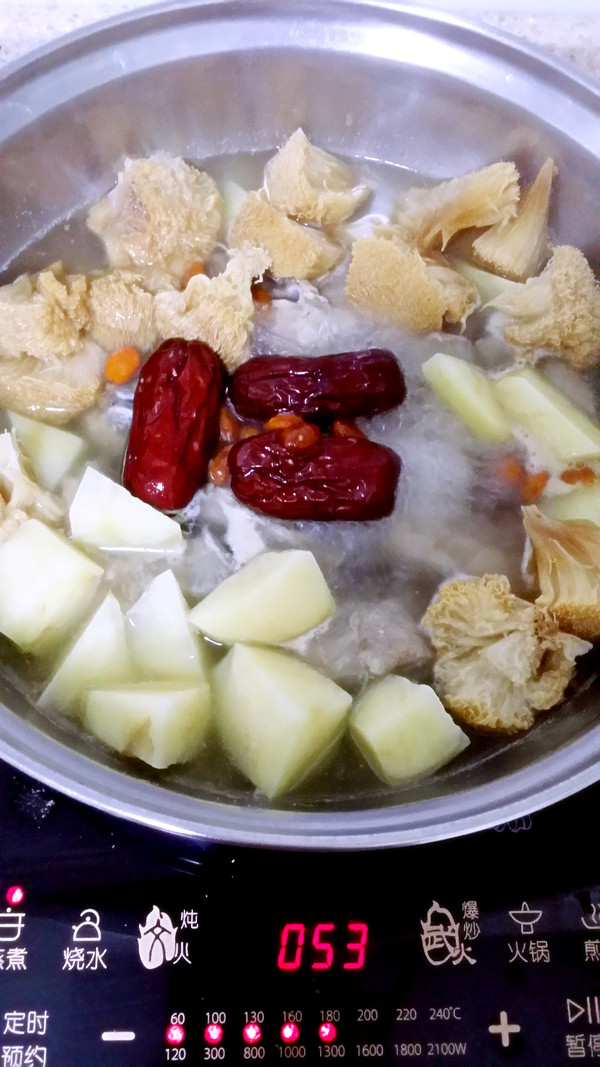 冷水放入排骨,烧开后放入猴头菇,干枣,枸杞子,土豆(山药)木耳,转中小火熬制1个小时。