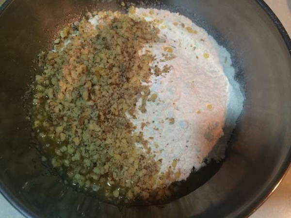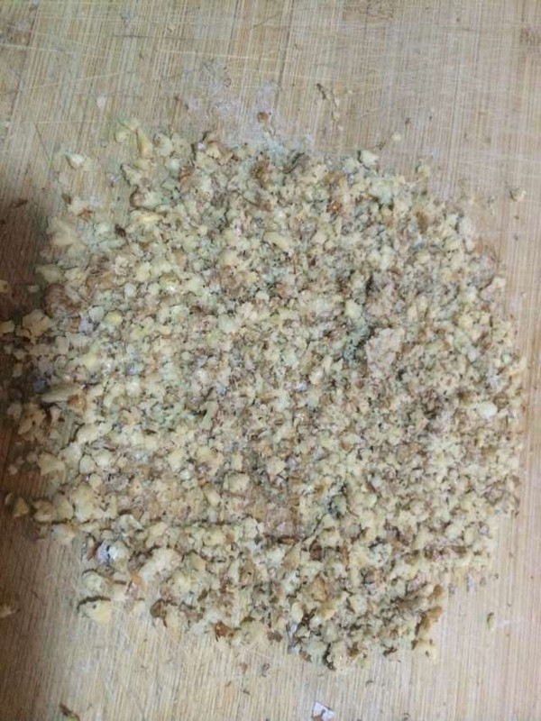 用擀面杖把核桃擀碎(没有核桃花生也行)