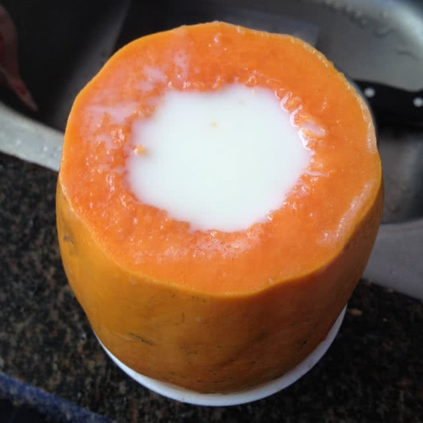 熟透的木瓜 从一头切开 用勺子把里面掏干净 放在一个小碗上