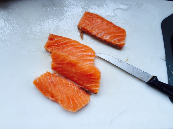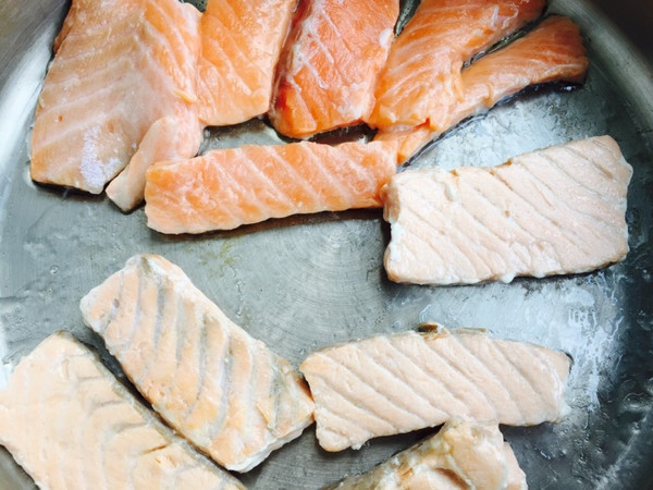 腌制好的三文鱼用厨房纸吸去多余水份,放入锅内,注意要小火;